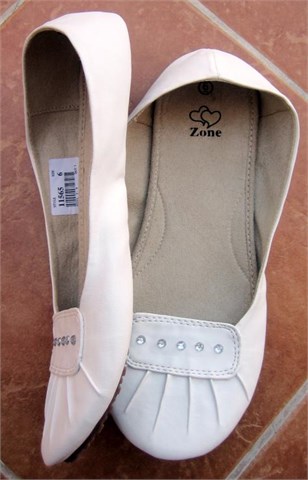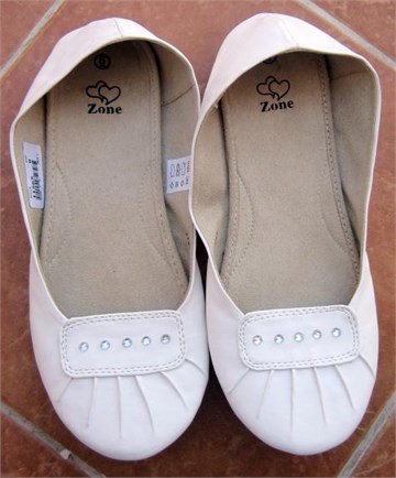 Preslatke balerinke bijele boje sa ukrasnim cirkonima i ukrasnim prošivima. Unutrašnjost je poput brušene kože (umjetni materijali) i vrlo su lagane i udobne za nošenje.