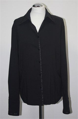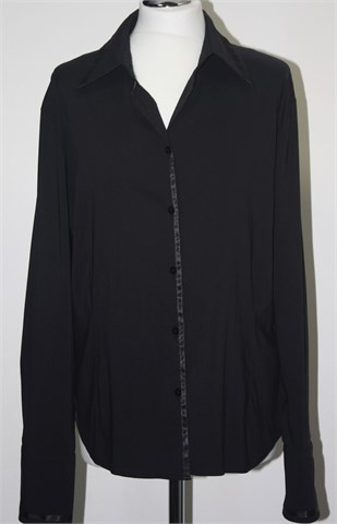 Zoya košulja sa dugim rukavima, crne boje sa ukrasnim crnim trakicama (na ovratniku, oko kopčanja i na krajevima rukava). Prednje kopčanje, blago strukirana. Lagan, blago svilenkast i rastezljiv materijal.