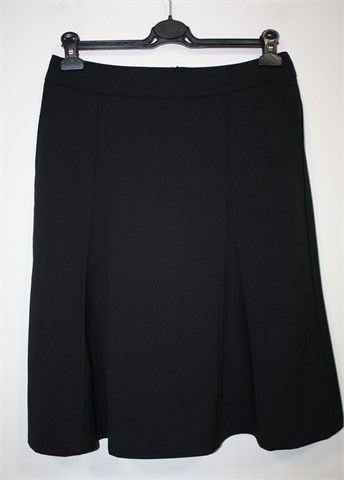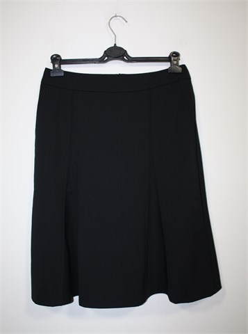 iBlues suknja klasičnog kroja, crne boje. Faldasti prošivi sa prednje i stražnje strane, stražnji cif i kopčica. Tanji, glatki štofasti materijal. Blago rastezljiva.